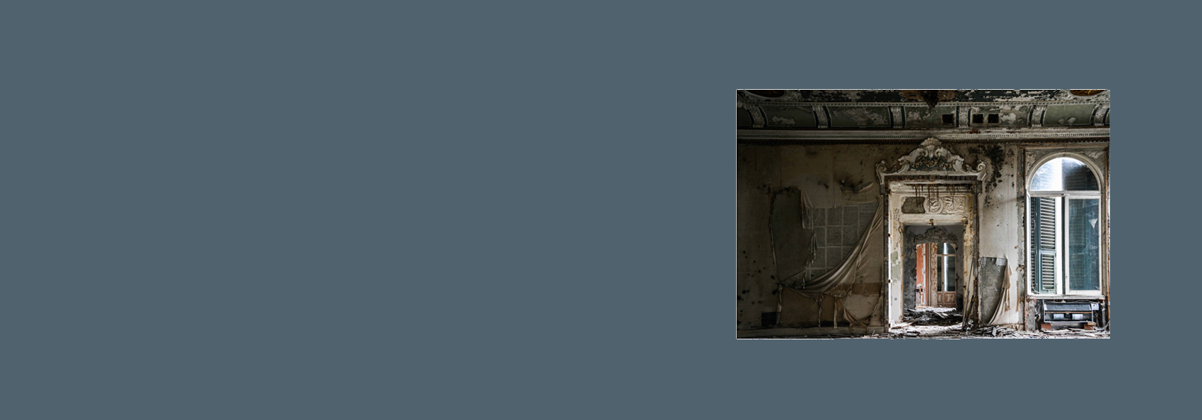 ART OF DECAY by Andrea Meloni is the first of the three winning projects for the OUT OF FOCUS call to be hosted at the showcasing venue in the Mario Gromo Library/Mediatheque, from 23 October to 20 December 2017. Eight strong, appealing, large format images, which are ensconced in the established tradition of locations photography, depicting the spaces of old decadent buildings as a projection of the author’s inner state. The sense of solitude and neglect that transpires from these pictures is not only physical, but emotional too.
